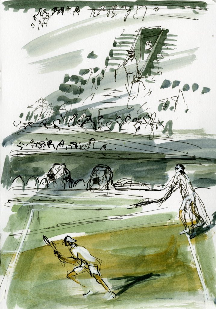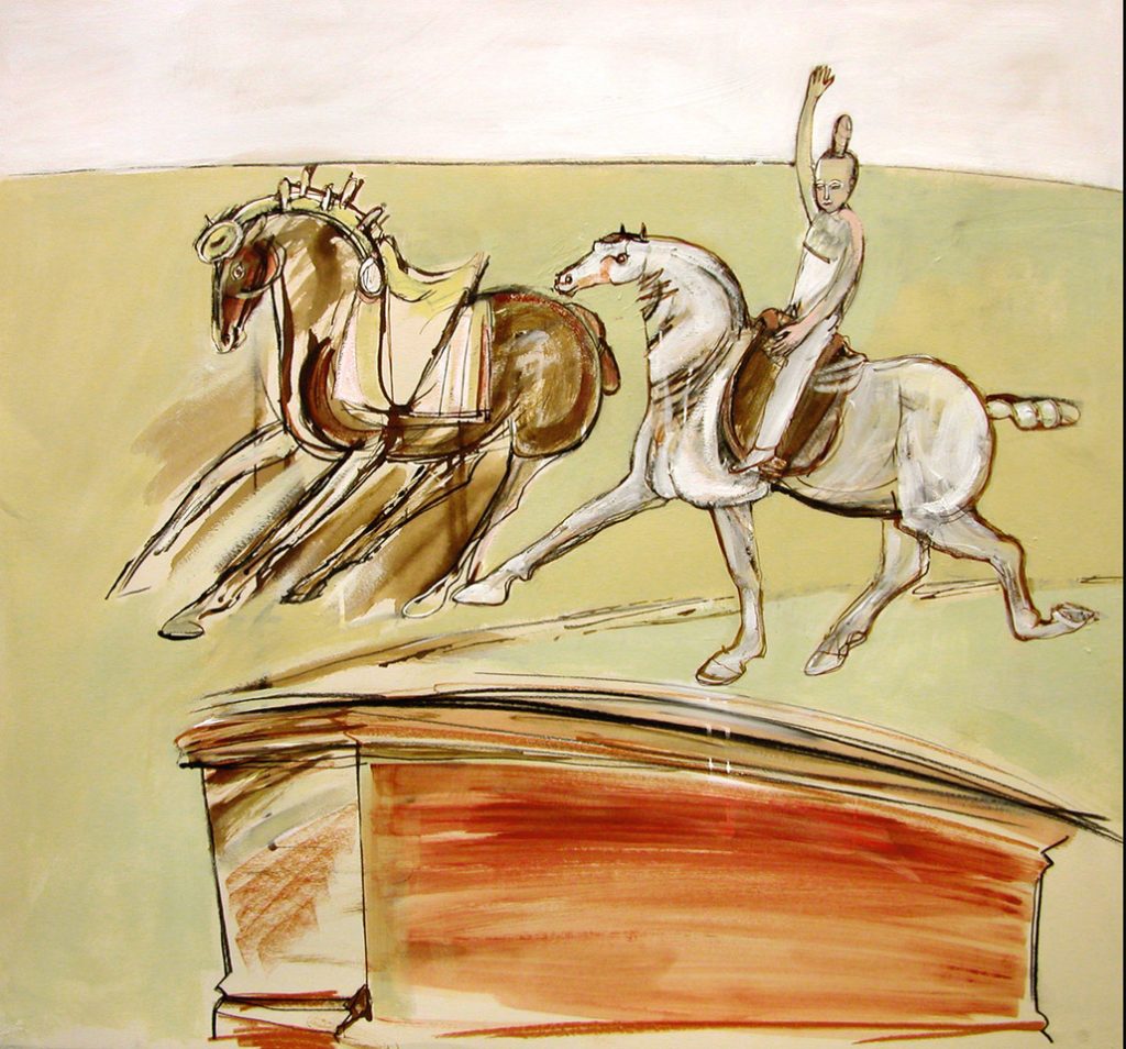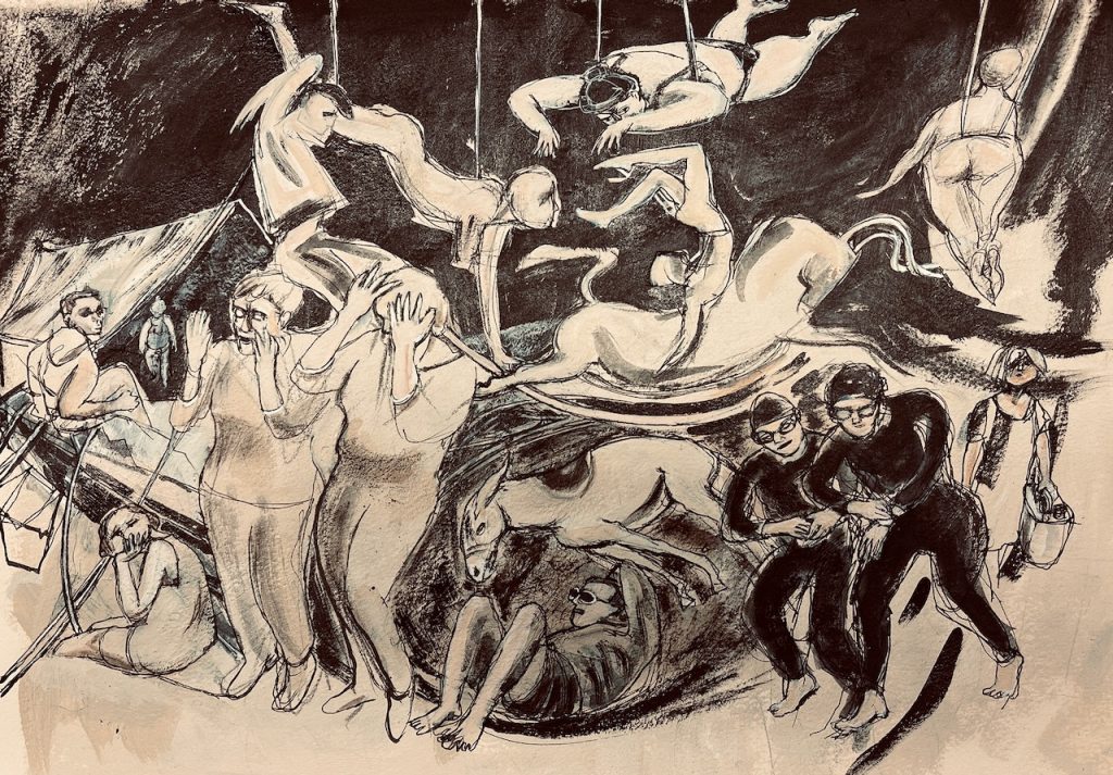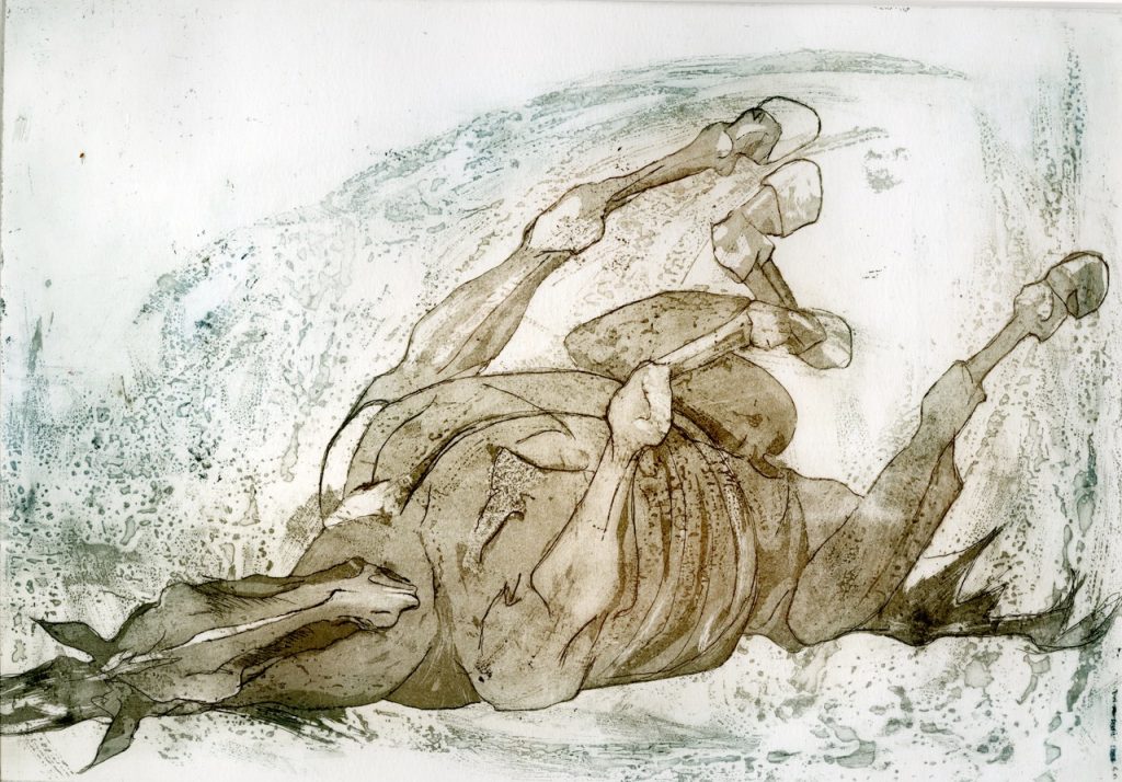 Drawing from direct observation is the bedrock of Julia’s practice, it informs the images produced in her Cheshire studio whether works on paper, or, etchings. Acting as a fly on the wall she records her observations in sketchbooks. Always interested in movement, anatomy, and medicine, her name has become increasingly associated with Reportage and printmaking.
